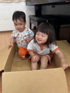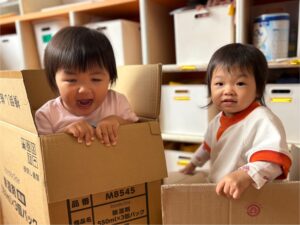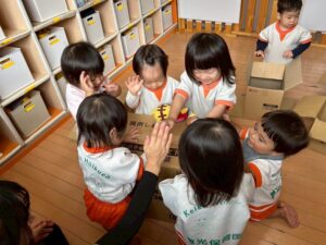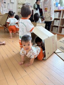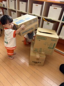 おっ、箱の積み木、よいしょ、よいしょ😊