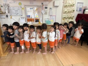 『手を洗うよ』と先生がこえかけると、みんな上手に並んでました。すごいねぇ〜、りす組さん💓