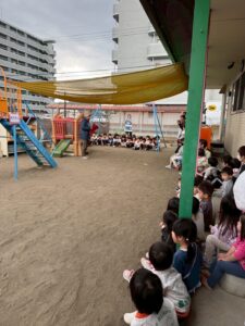 避難後は先生のお話を聞きます。みんなしっかりと聞けています。よく頑張ったね^^