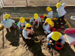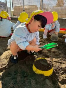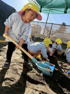 シャベルで掘ってみたり、それぞれの遊び方で楽しみます^^