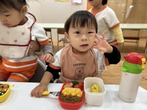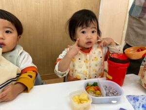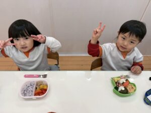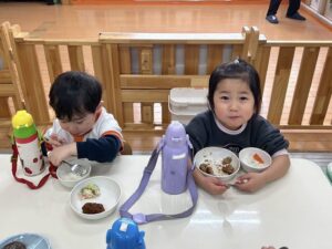 いつもは机が離れているあひる組さんとりす組さんなので、向き合って食べれて嬉しそうでした。