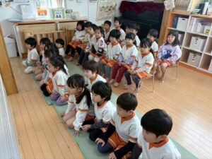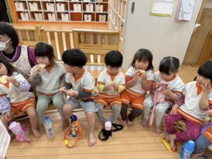 お弁当日のおやつは、みんなで円になって食べます。