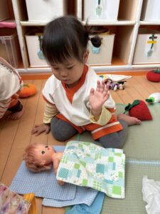 お人形さんにお布団をかけてあげて、トントンしたり、