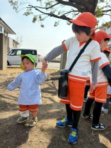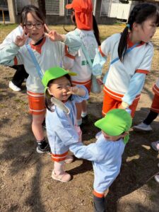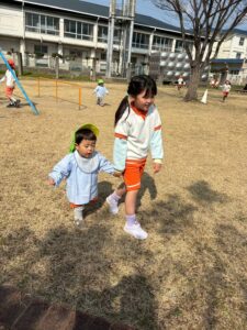 りす組はお友だちと手を繋いで歩く練習をしています。