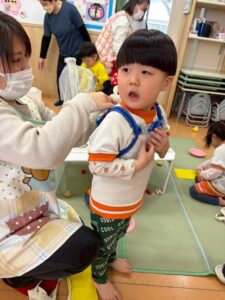 次のクラスに向けてあひる組さんはお散歩ロープ、