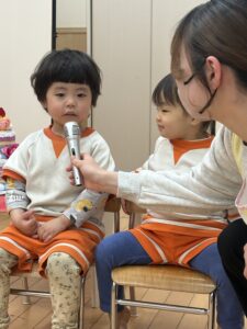 先生に一人ずつ、お誕生日を紹介してもらいます🥰マイクをむけると、うふふ🤭はずかしそうです😊
