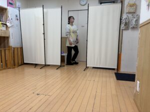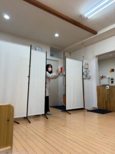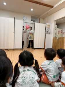 先生からのプレゼント🎁は『ついたての間に何が通るでしょう』クイズ🤭、そう、1番目は先生が通ったね。