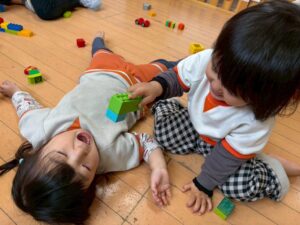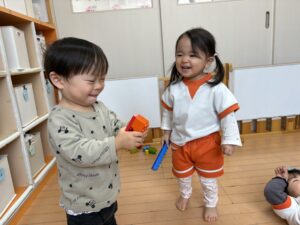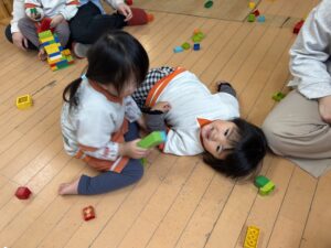 長いブロック、貸してあげる😊ありがとう、嬉しい💕と大喜びです。ちょっとずつ、貸し借りもできるようになってきています。言葉に上手にできなくて、けんかになっちゃったりするけど、みんな大好き💓仲良しです😘