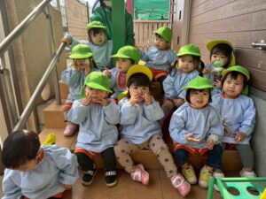 たくさん、体を動かして遊びました。お散歩楽しかったね。あー、お腹すいたぁ。今日の給食は何かな?