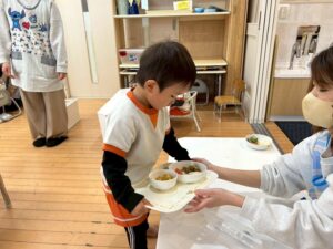 給食をおぼんに載せてもらったら、