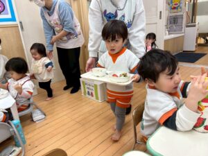 うさぎ組さんになったら、給食は自分でおぼんに載せて運びます。さぁ、練習してみようか?
