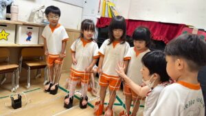 入場では、牛乳パックで作ったぽっくりに上手に乗って登場!練習を重ねるうちに、バランスを取るのがとても上手になりました。可愛らしく踊る姿は、見る人を笑顔にします。