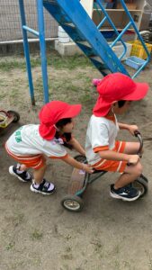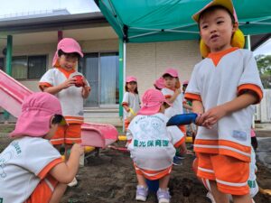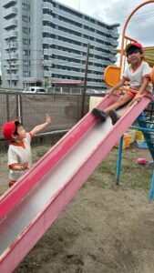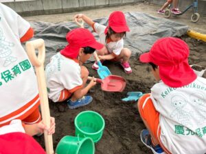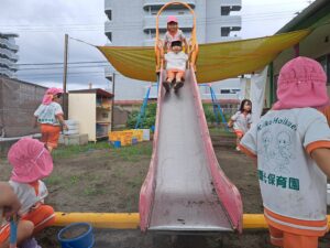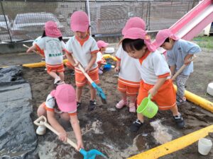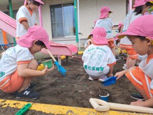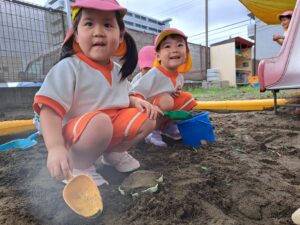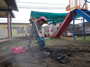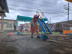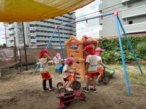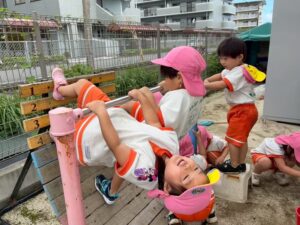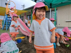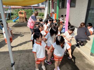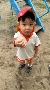日差しが弱かった日、久しぶりの園庭へ。「園庭に行くよ」と聞いて、みんな跳び跳ねて喜んでいました😊