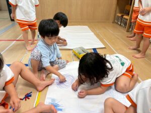 小さい紙の上ではなく、大きな模造紙だと、ダイナミックにのびのびお絵かきができます!
