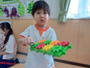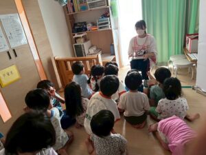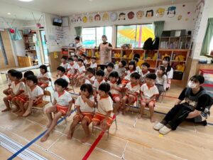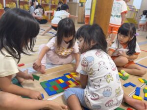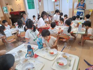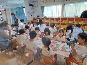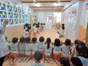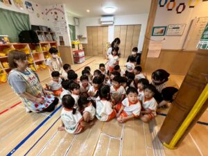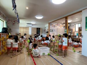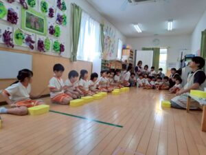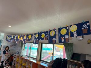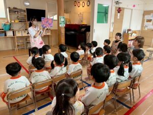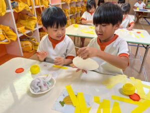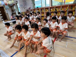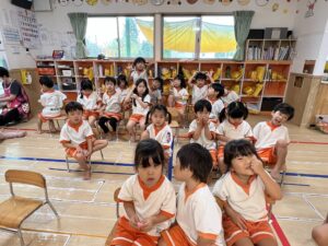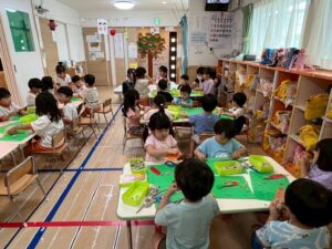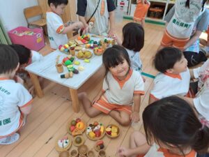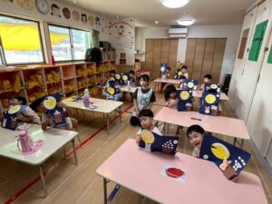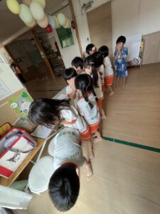 延期になっていた夏祭りを、土曜日各クラスは時間帯に分けて楽しみました!特に盛り上がったのは「魚釣りゲーム」。自分たちで作った魚を、真剣な表情で釣り上げます。「見て、こんなに釣れたよ!」と、あちこちで歓声が上がっていました。お家の方と一緒に楽しむ姿も見られ、笑顔あふれる素敵な時間となりました。