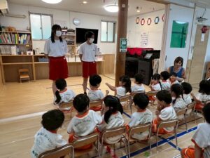 秋の気配が少しずつ感じられるようになった9月。今週から、うさぎ組ときりん組に新しい先生が仲間入りしました!別府短期大学から3人の実習生の先生が来てくれて、子どもたちは大喜びです。来週まで毎日2人ずつクラスに入り、たくさん遊んでくれます。
