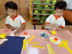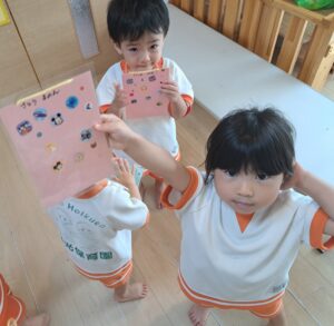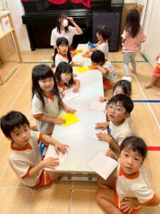 大好きなおじいちゃん、おばあちゃんのために、心を込めてメッセージカードを作りました。ハサミやのりを上手に使って、きれいなコスモスの花を咲かせます。「いつもありがとう」の気持ちが届くように、一人ひとり一生懸命でした。完成した素敵なカードは、ぜひお家でご覧ください。