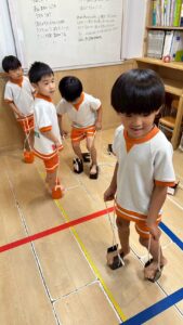手足のバランス感覚、手足の協調性、足の指先の運動、体幹バランスが必要になるぽっくり!「同じ側の手足を同時に出す」という普段と異なる動きで難しいですが、乗ってしまえば多くのこどもたちが上手に歩けていました。足をかける乗りはじめに苦戦する子も多いですが、これから遊びの中で、上手に乗れるようになると思います!乗ったままジャンプしたり小走りができる子もいて、数人で競争もしてみましたよ!