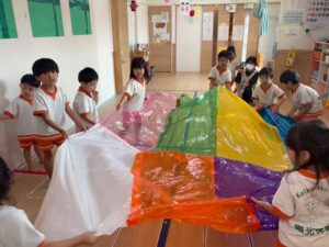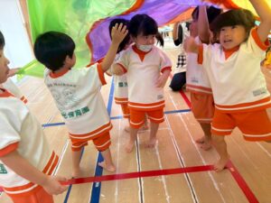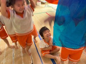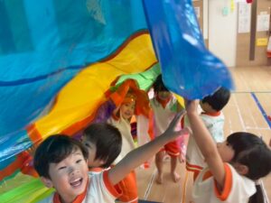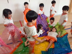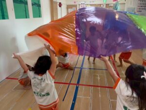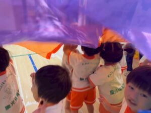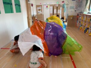 みんなで袋のふちをもち、空気を沢山あつめたり、バルーンの中に皆ではいってみよう!