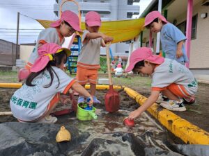 砂の色の変化に気づいた子が、濡れた土の上に乾いた白砂をかけてカレーライスを作っていたりして楽しんでいました。