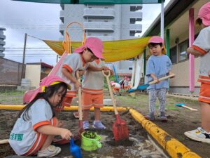 雨上がりの水溜まりは、こどもたちにとって最高の遊び道具のようで、スコップで混ぜてみたり、コップを浮かばせたり、水を追加したりしてとっても楽しそう🎵「今、工事してる!」と、スコップで道を作っていたり、雑草をサラダに見立て、泥水コーヒーを添えてみたり、