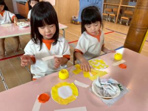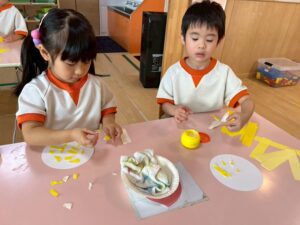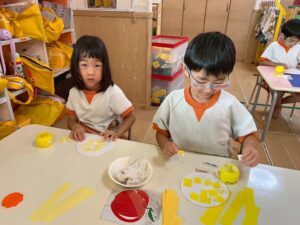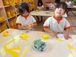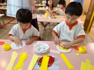 敬老の日に向けて、コスモス作り。前回の製作でも直線ぎりは行っているので、また少し上手にはさみを持てるようになっていました!