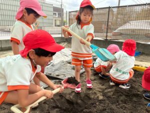 ポカポカとした気持ちの良いお天気の中、園庭遊びを楽しみました。砂場では、みんなで大きな山を作ったり、お料理ごっこをしたりと、協力しながら夢中になって遊ぶ姿が見られました。鉄棒に挑戦する子や、お友達と三輪車で競争する子など、戸外でのびのびと体を動かし、心も体もリフレッシュできました。
