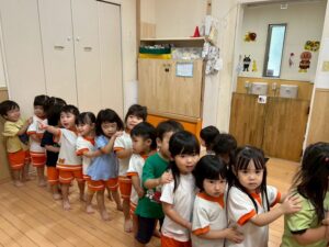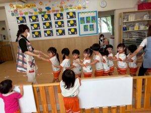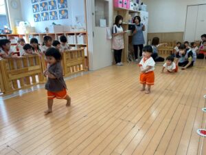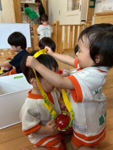 あひる組さんは、お名前を呼ばれてお返事するのがとても上手なお友だちが多く、りす組さんもお名前呼びはもちろん順番を待つこともできるようになってきました。