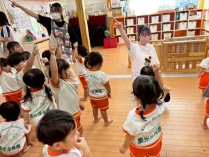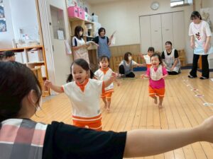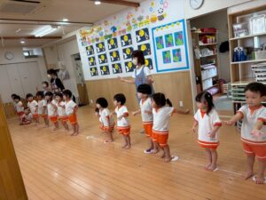 準備体操のダンスでは、先生の真似をしながらあひる組さんもりす組さんもとても上手に踊っています✨️
