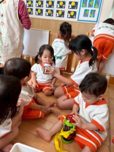 運動会練習の後や、帰りの会後の水分補給では、らいおん組さんに飲ませてもらったり、お友だちと飲ませ合いっこをしている姿がよく見られます(*^^*)