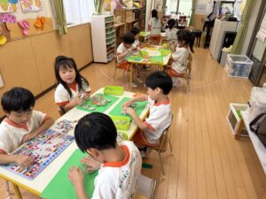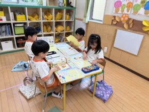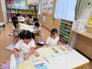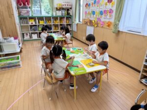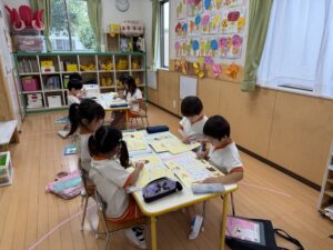 朝の会も、朝のお歌をしたりお返事したり、今日の天気を窓の外で確認したりしています♪