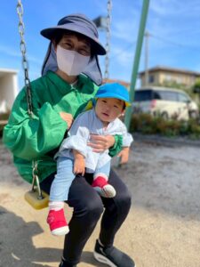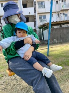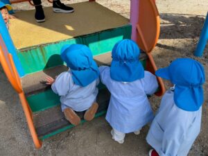 団地の公園では、滑り台を滑ったり、遊具の階段を「よいしょ」と頑張って登ったりと、体をいっぱい動かして楽しむ姿が見られました。