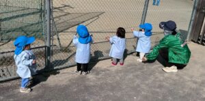 小学校裏の公園からは、小学校のグラウンドが見え、運動会の練習をしているお兄さんお姉さんたちの姿が見えました。楽しそうな音楽が流れてくると、自然と体を揺らしたり、手を叩いたりして、にこにこ笑顔のひよこ組さんでした。