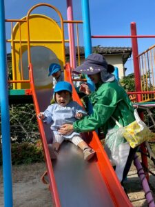 団地の公園では、滑り台を滑ったり、遊具の階段を「よいしょ」と頑張って登ったりと、体をいっぱい動かして楽しむ姿が見られました。