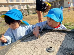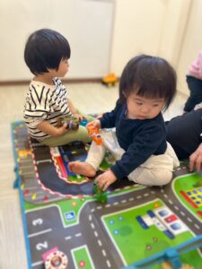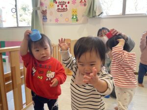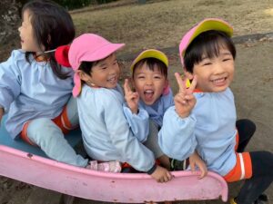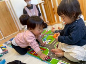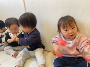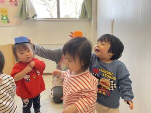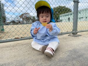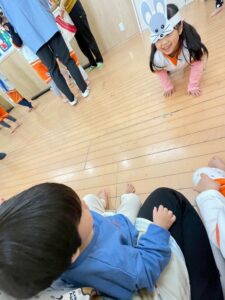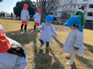 次は、鬼ごっこ!最初は保育士が鬼役でしたが、だんだん自分も追いかける役がしたくなったようで、だんだん「タッチして!」の流れに。五人タッチできたら、鬼希望のお友だちと交代していきました。「僕(足)はやいやろ?」と、得意気な子もいれば、「何でよ~💦」と、タッチされて泣いちゃう子も。それでも、悔しい経験を重ねる中で、気持ちの切り替えまでが早くなってきたね!すぐに立ち上がって遊び始める姿に成長を感じます。