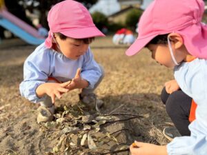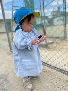 近くの小学校をじーっと覗いてみたり、そばにあった葉っぱを手に持ってみたりと様々なことによく気がつくみんなです(^-^)