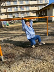 冬の寒さに負けず、子どもたちは元気いっぱい!特に最近のきりん組さんは、身体能力を試す遊びに夢中です。鉄棒にも果敢に挑戦し、「逆上がりできるかな?」「あと少し!」とお友達と励まし合いながら体を動かしています。戸外遊びを通じて、体力と粘り強く頑張る心を育んでいます。