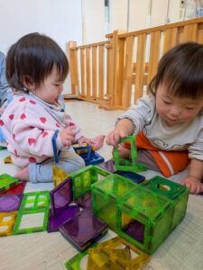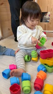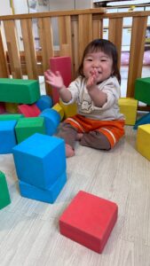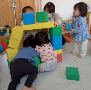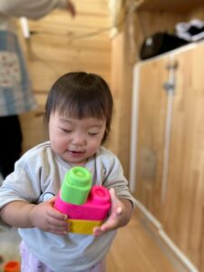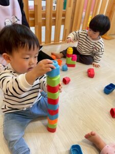 保育者と一緒に積み重ねて、壊して遊んだり♪