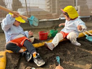 この日も気温が暖かったので、「水使用🆗️だよ~!」と声かけすると、何度も何度も水を運ぶこどもたち。水道と砂場の往復メンバーがひたすら忙しそうに横切ります😁