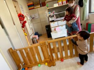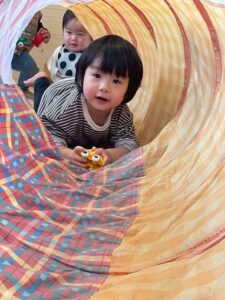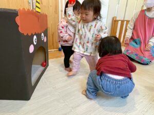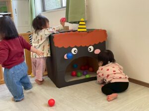 みんな豆に見立てたボールをポンポーン!と上手に投げ入れたり、中に入ってみたりと、全然へっちゃらで遊んでいました!!