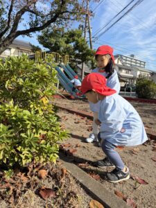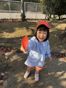 また、足元には赤や黄色に色づいた落ち葉がたくさん。「見て!きれいな色!」と秋の自然に触れながら、のびのびと過ごすことができました。