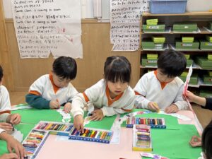 今回は画用紙にクレヨンで好きな模様や色を塗って、帽子のデザインを考えました。