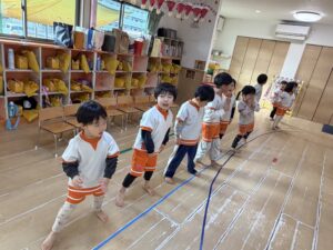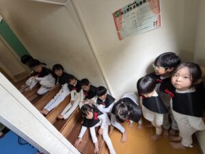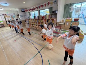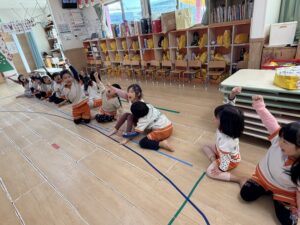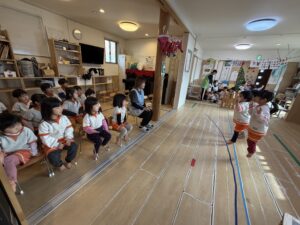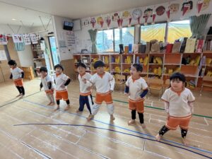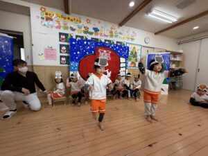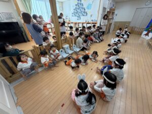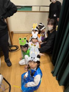 お隣のうさぎ組さんとも演目を見せ合いました。「ダンスかっこいい!」「歌が上手だね!」とお互いに刺激し合い、本番へのやる気がさらにアップしたきりん組さんでした。