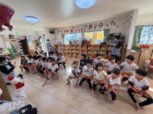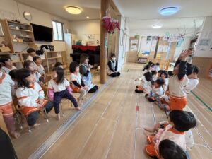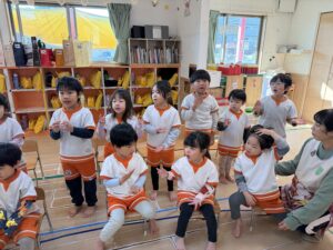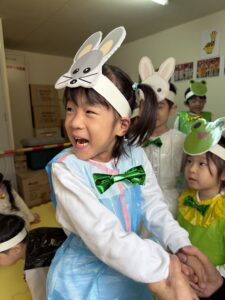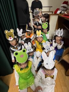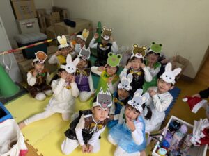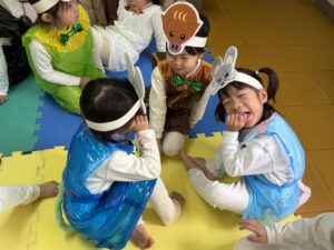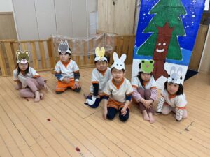 本園1に移動し、未満児クラスのお友達の前でオペレッタ「てぶくろ」を表現しました。可愛い観客を前に少し照れながらも、役になりきって堂々と演じる姿に、お兄さん・お姉さんとしての成長を感じました。