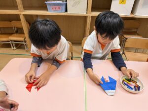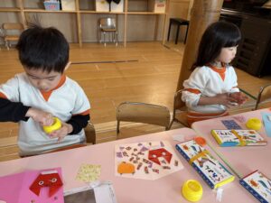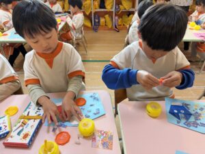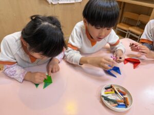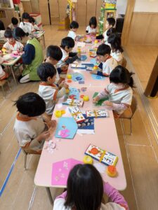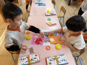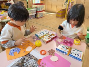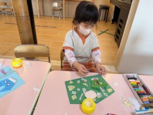 • ちぎり絵の装飾:色とりどりの折り紙をちぎって糊で貼り、華やかにデコレーション。
