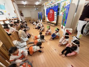 残念ながら、きりん組では1名のお友達が、ご家族のインフルエンザによる感染予防のためにお休みとなってしまいました。クラス全員が揃わない寂しさはありましたが、子どもたちの心は一つ!「お休みしているお友達の分まで頑張るぞ!」と、みんなで気合を入れてステージに向かいました。