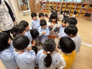 また別の日には、うさぎ組さんと合同で「節分の豆作り」を行いました。