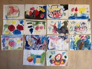 これらを伝えてからお絵描きを始めると、みんなの表情は真剣そのもの。「水が多いと色が薄くなるね」「優しく洗うときれいになるね」と、筆の感触や色の変化を丁寧に楽しみながら描いていました。