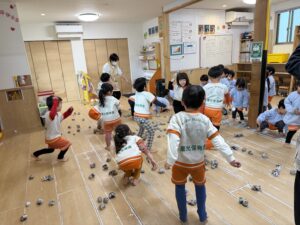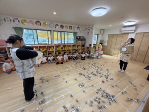 「がんばれー!」「ここに入れるんだよ!」と、小さいお友だちを応援したりリードしたりする姿が見られ、大盛り上がりでした。来週の節分本番に向けて、鬼退治の準備は万端です!