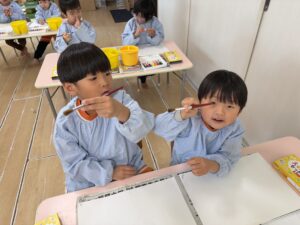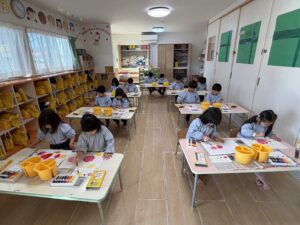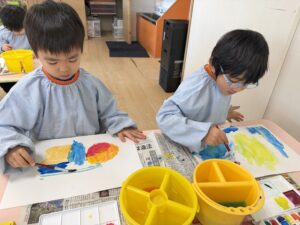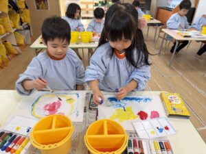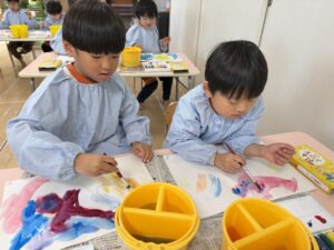 これらを伝えてからお絵描きを始めると、みんなの表情は真剣そのもの。「水が多いと色が薄くなるね」「優しく洗うときれいになるね」と、筆の感触や色の変化を丁寧に楽しみながら描いていました。